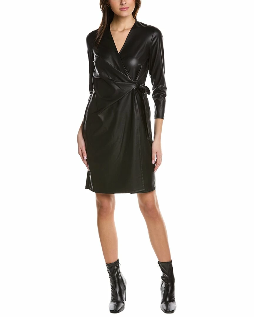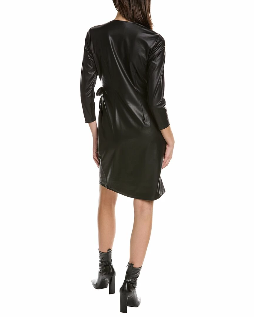 - Classic Wrap Dress In Black With Pleather Design And Tie At Waist