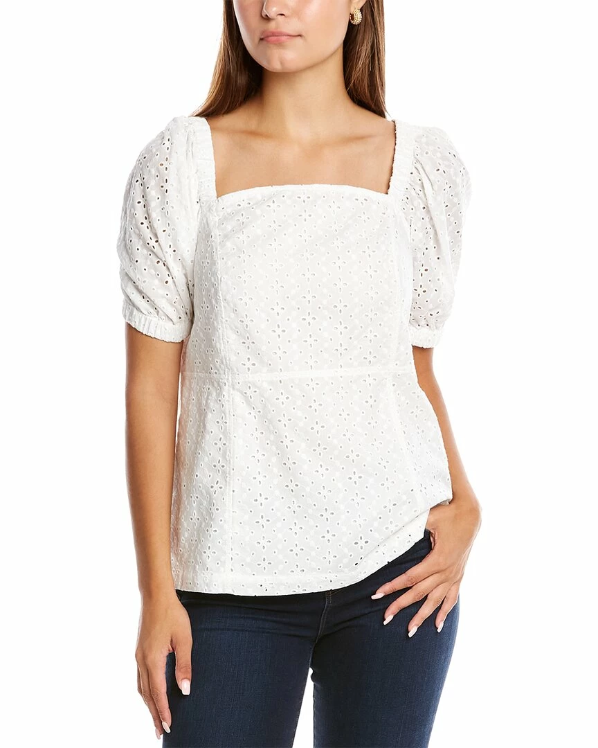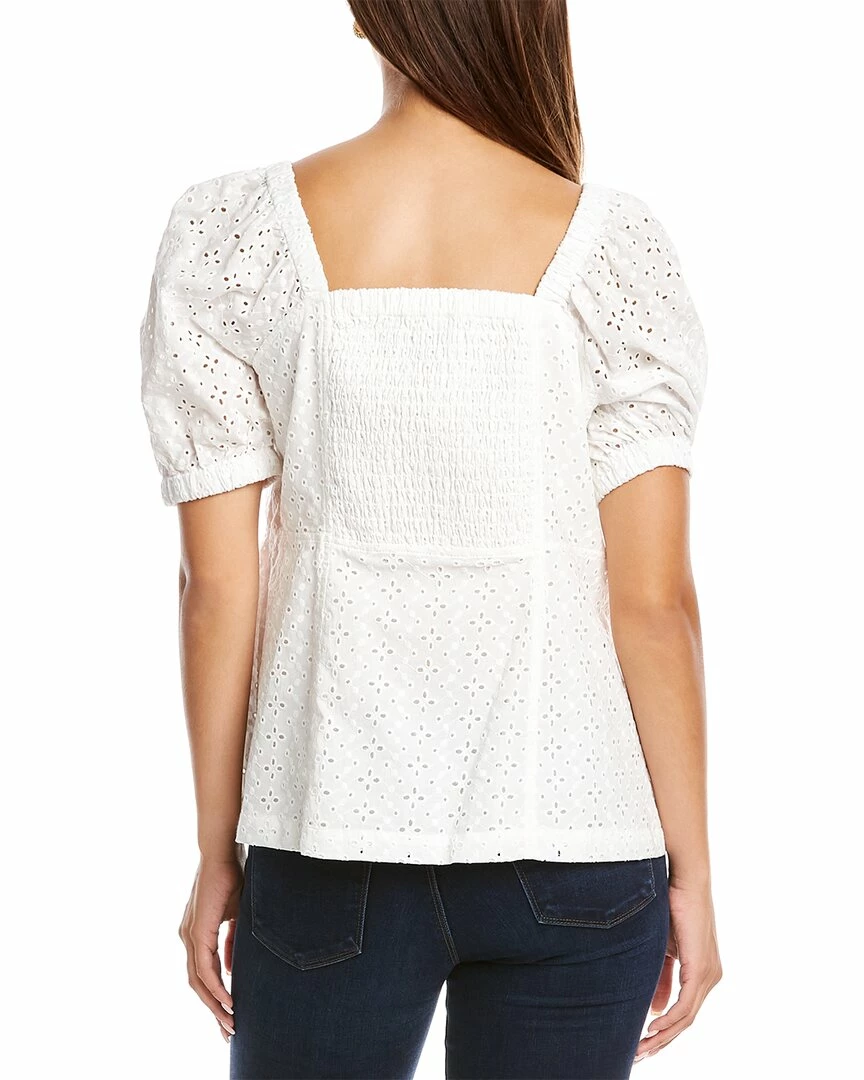- Eyelet Peasant Sleeve Blouse In Bright White With Square Neck, Puff Sleeves, Smocked Back Waist, And Embroidered Design