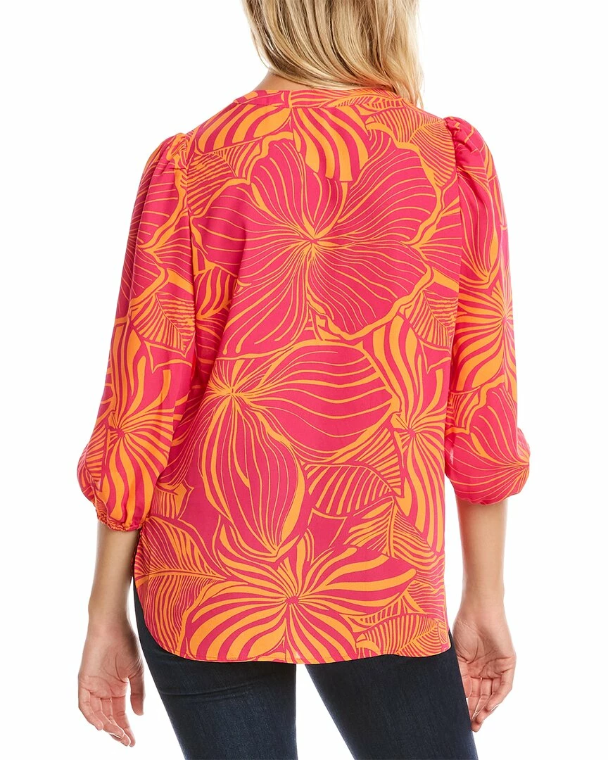 - High-Low Blouse In Pink Pansy And Orange Peel With Puffed Shoulders And 3/4-Length Sleeves