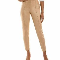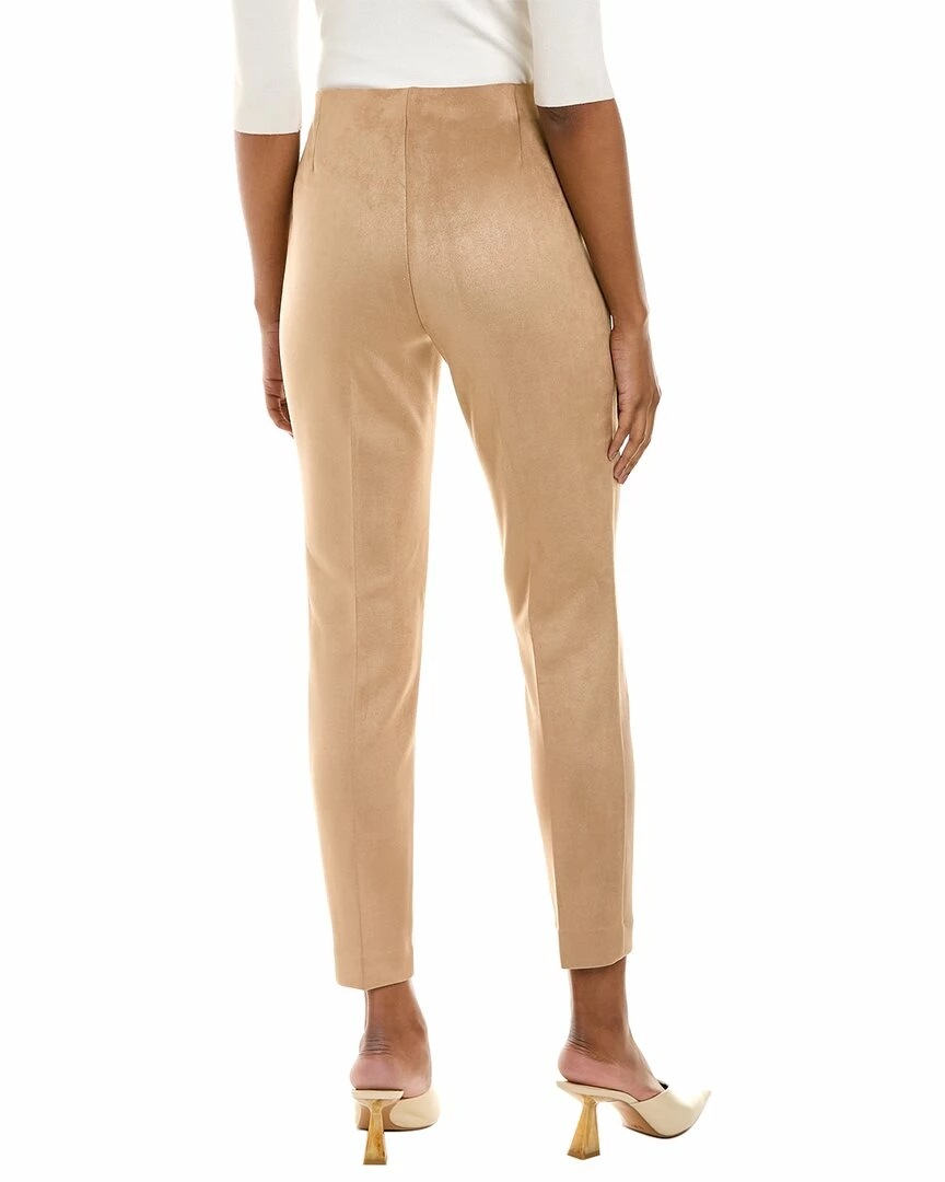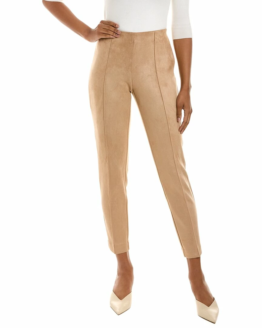 - Hollywood Slim Ankle Pant In Beige With Suede-Like Texture, Elasticized Waistband, And Center Pleats Down Pant Legs