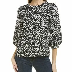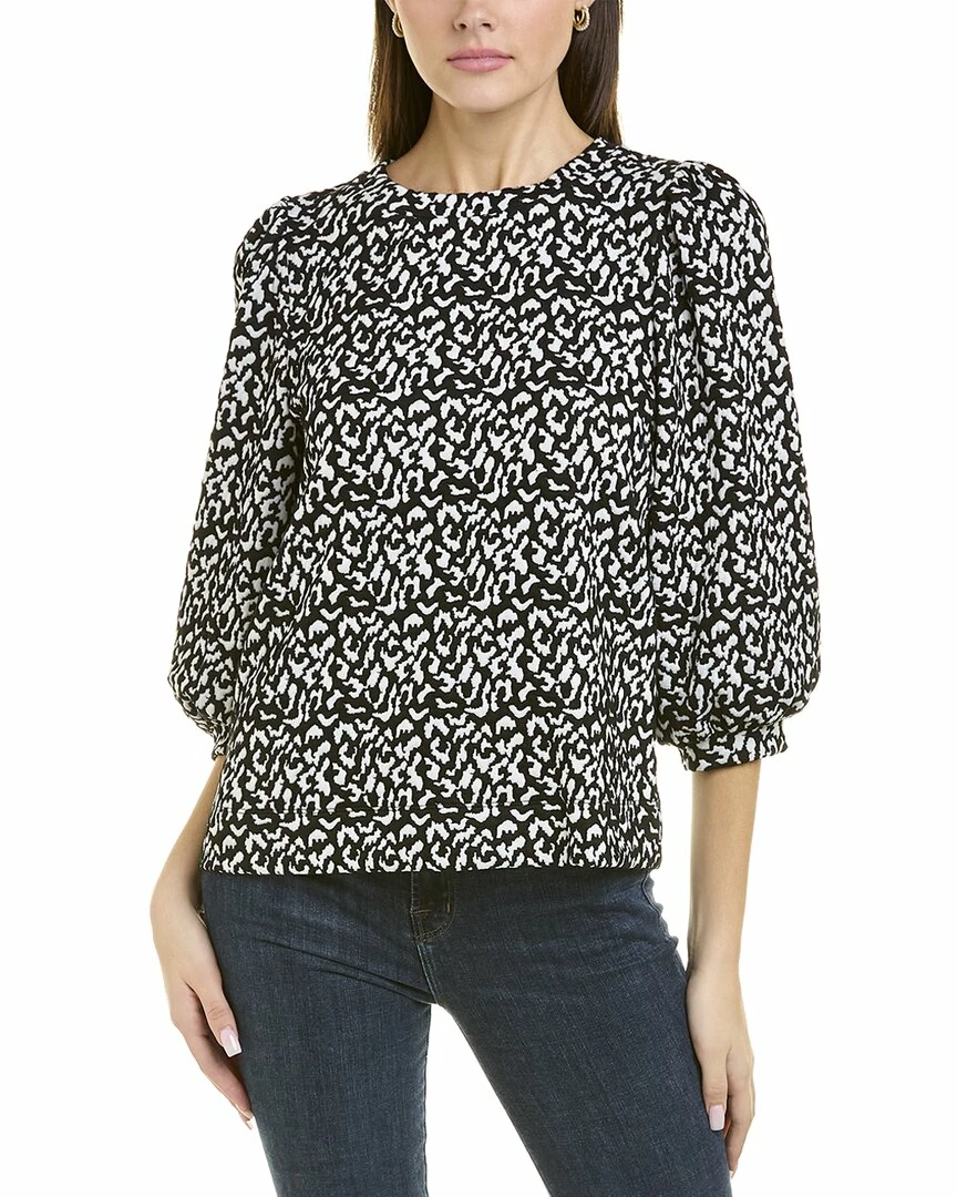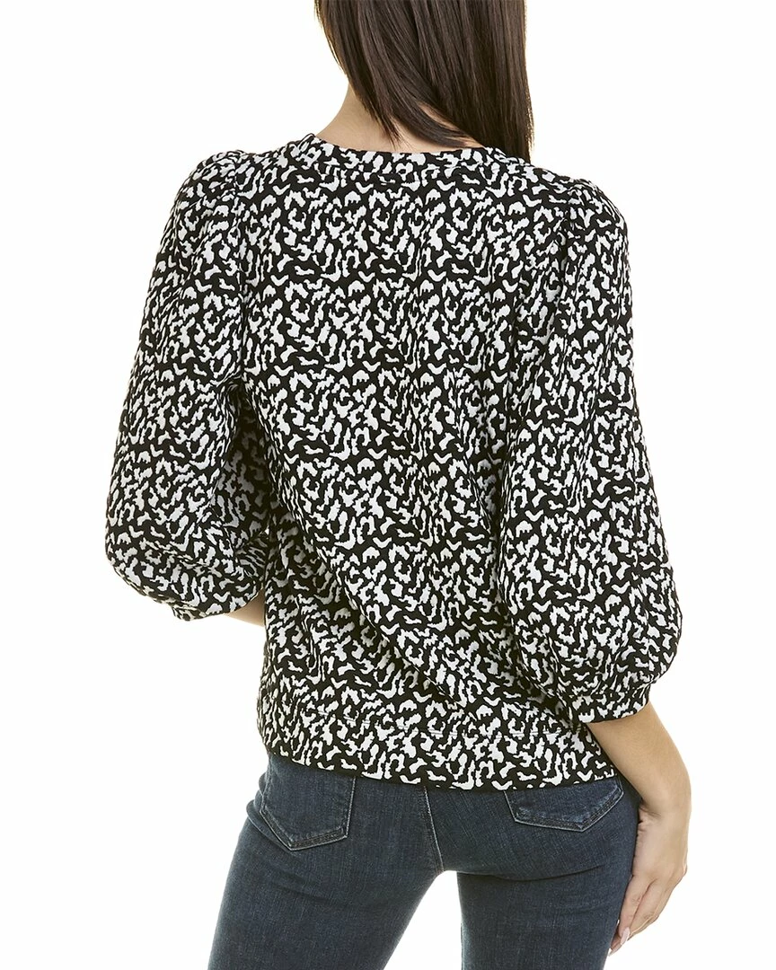 - Jacquard Top In Black And White With 3/4-Length Balloon Sleeves