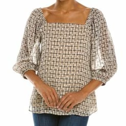- Plaid Popover Blouse In Bisque And Light Coffee Check With 3/4-Length Sleeves, Square Neck, Elasticized Cuffs, And Side Slits At Hem
