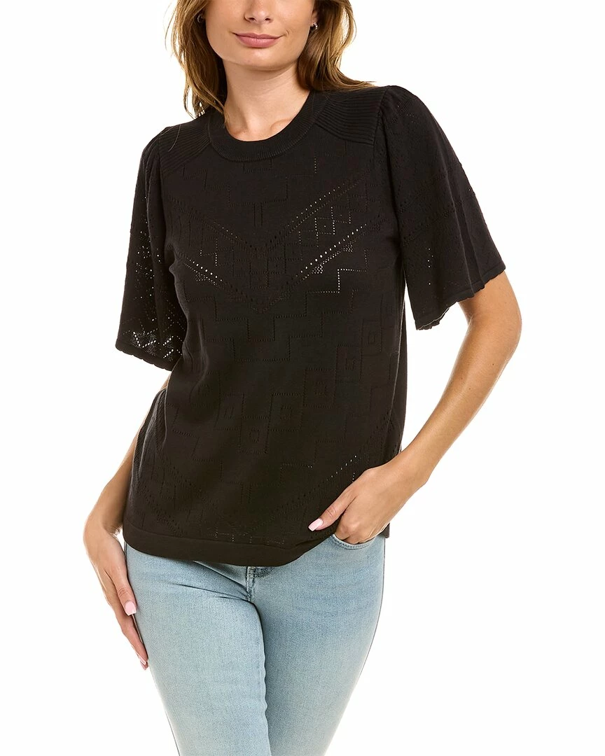 - Pointelle Sweater In Black With Ribbed Shoulders And Flare Sleeves