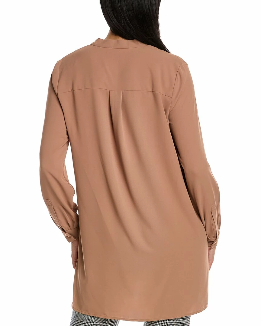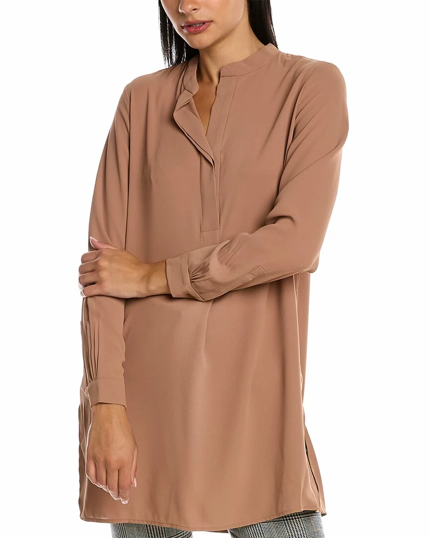 - Popover Blouse In Vicuna With Mandarin Collar, Pleated Details At Button Cuffs, Box Pleat At Back, Front Pleat, And Side Slits At Hem