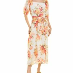 - Printed Dress In Bright White Combo With Square Neck, Elasticized Shoulders, Elasticized Cuffs, And Elasticized Waistband