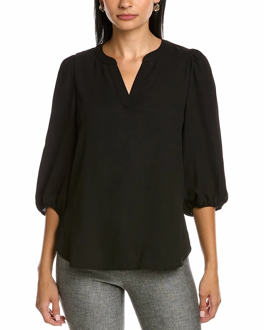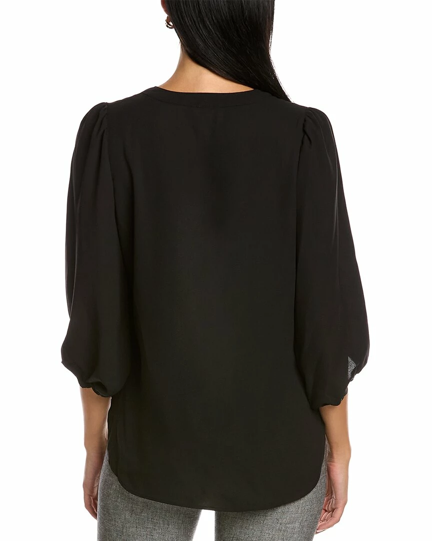 - Split Neck Blouse In Black With 3/4-Length Puff Sleeves And High-Low Hem