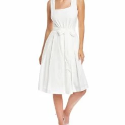 - Tie Waist Linen-Blend A-Line Dress In Bright White With Pleated Skirt And Side Seam Pockets