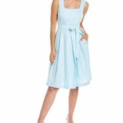 - Tie Waist Linen-Blend A-Line Dress In Ocean Sky With Pleated Skirt And Side Seam Pockets
